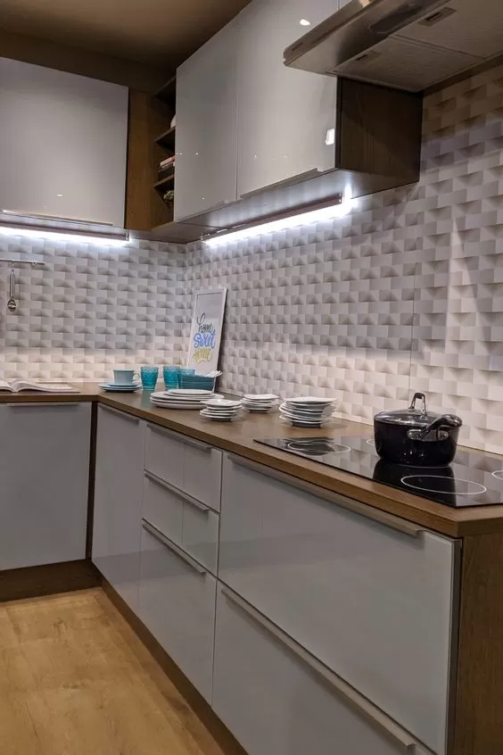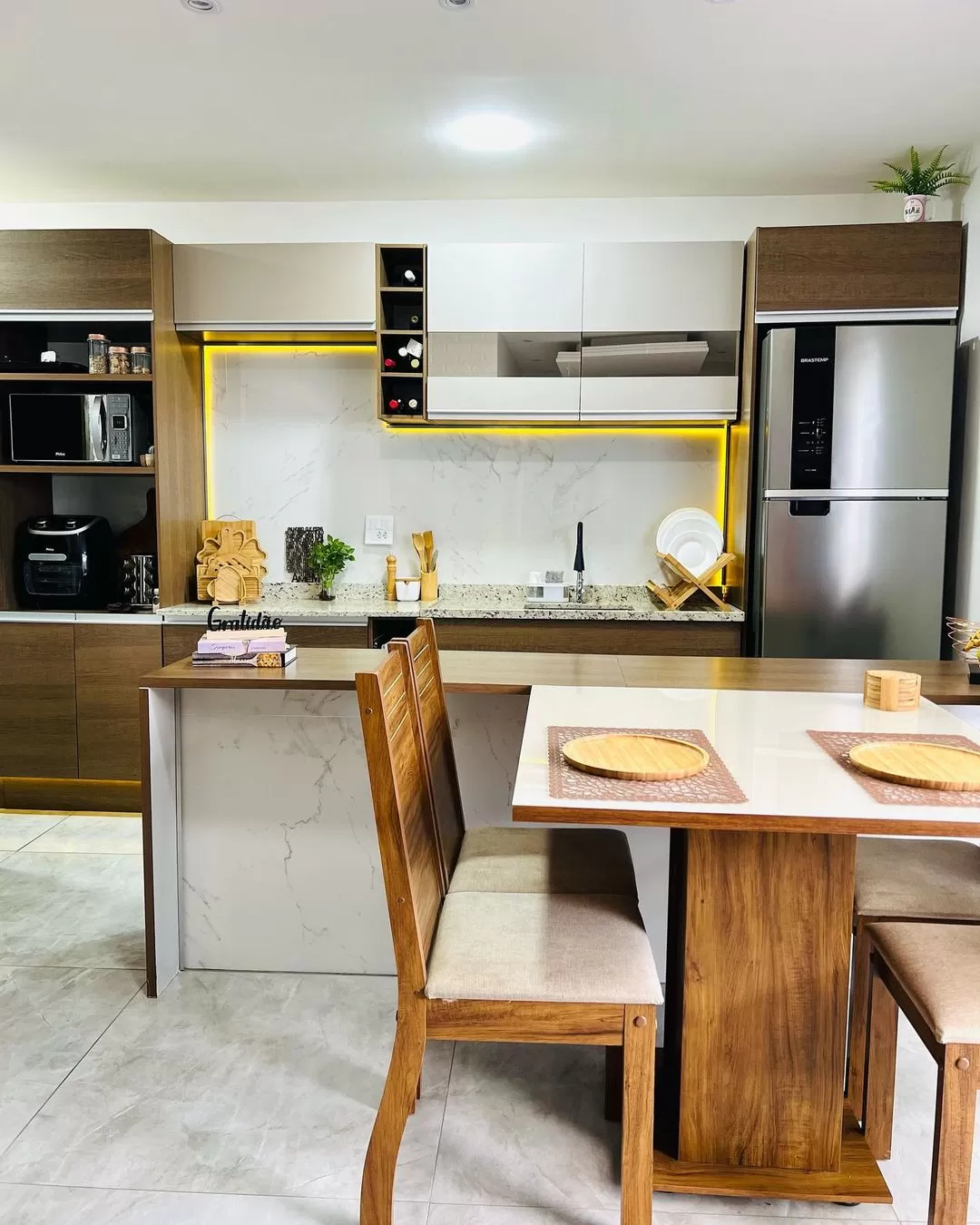 - granito ou quartzo branco com armários amadeirados;