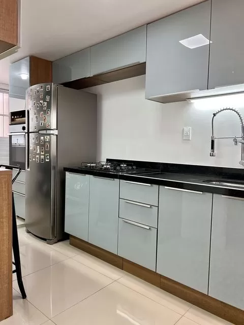 Em algumas, como a cozinha Lux, as portas e gavetas recebem um vidro cinza aplicado. O resultado é um ambiente muito mais elegante.