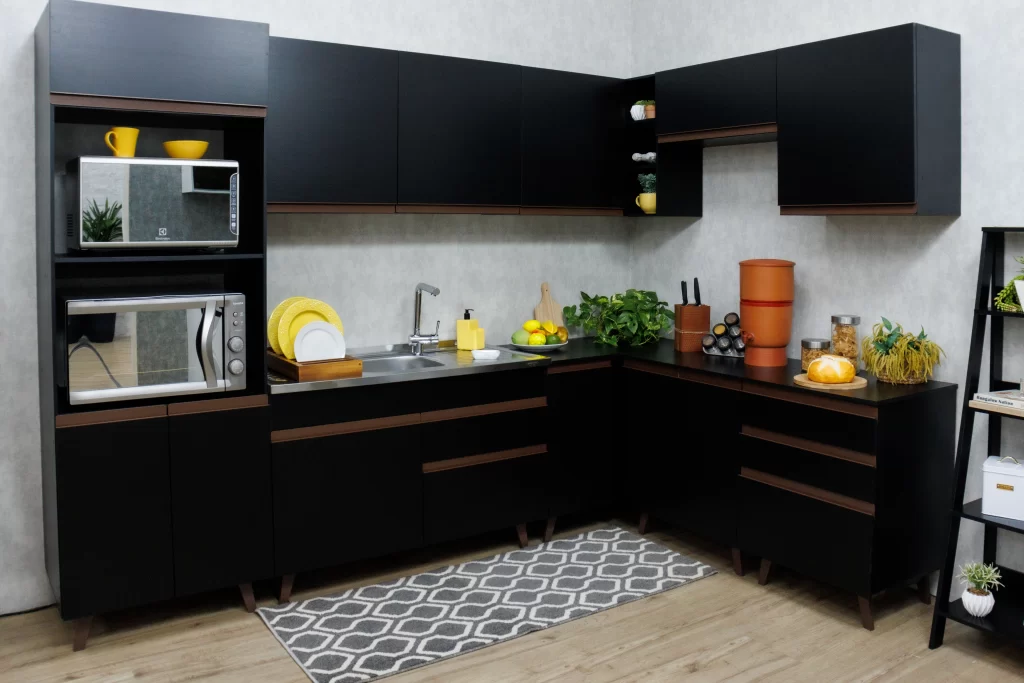 O Armário de Cozinha Completa de Canto 462cm Preto Reims Madesa é indicado para quem prefere um visual moderno e marcante, combinando estética e funcionalidade com módulos pensados para o canto.